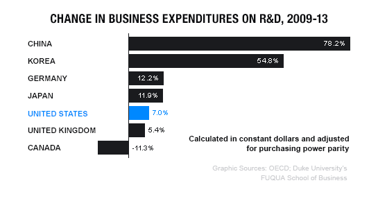 根據杜克大學商學院的研究,在2009-2013年之間,各國貿易投入在R&D (Research & Development)研發的比重來看,中國的研發比例儼然超過美國一大截。