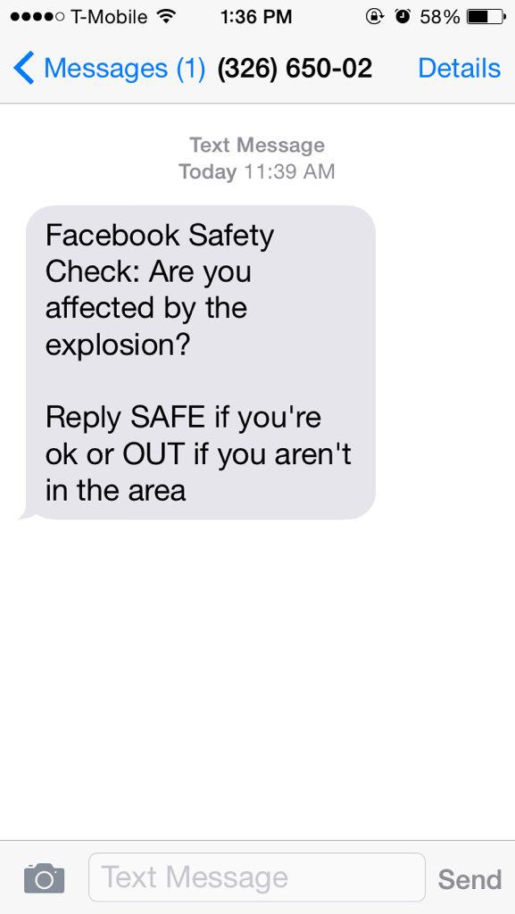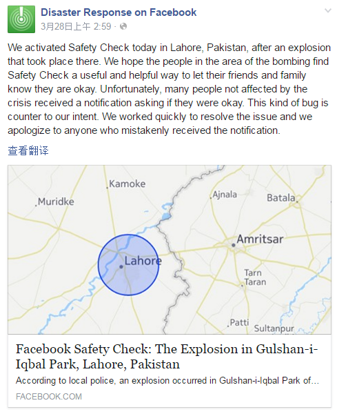 (圖片來源:推特) 可是當戴爾先生慌忙望向窗外,卻只見天空晴朗,街道上行人自若,哪有半點失事了的痕跡?類似的短信也發到了印度等國家Facebook用戶的手機上,用戶之間廣泛傳播,一時間人心惶惶。 事實上,這是在當天巴基斯坦發生爆炸事件后,Facebook啟用平安信使功能,將通知發送給受到波及的地區用戶,讓他們在Facebook上向親朋摯友報個平安。但由于程序錯誤,這則信息被發送到了遠在美國、歐洲、東亞的用戶,不明真相的用戶接到提醒后,造成了小規模的恐慌。 烏龍事件在推特等社交網絡上引發燒議,有用戶批評Facebook是在添亂。Facebook官方也在晚些時候發出報歉。