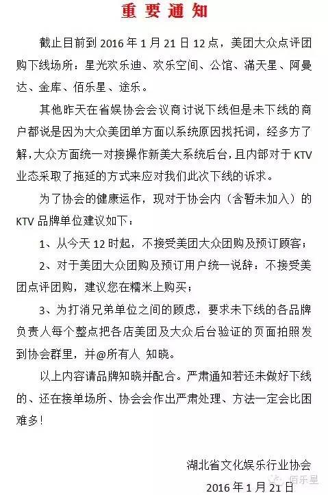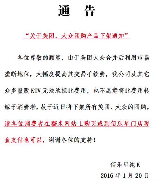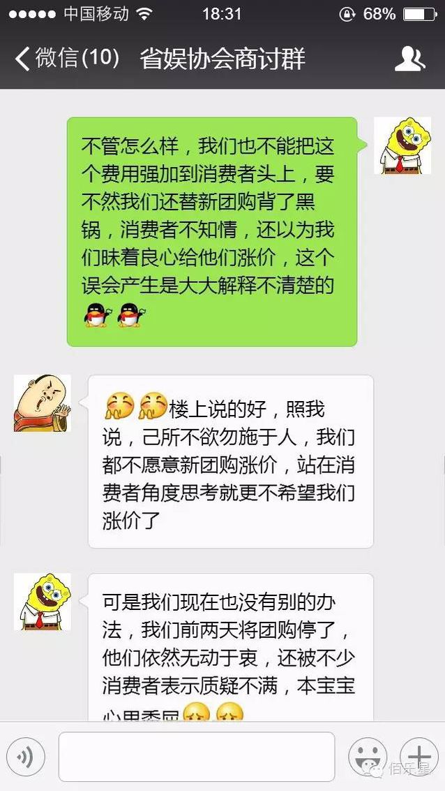 動靜是從一個名為“省娛協會商討群”的微信聊天截圖爆出來的,當事者為武漢KTV商家表示,新美大合并后,將原來的手續費由2%漲到12%,商家在討論群里集體表示,在團購的影響下,業務利潤已經很低了,再多收取抽成點,獲得收益甚至不足以支撐基本糊口。