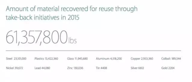在昨天晚上,蘋果發布了年度環保講演,在講演中,蘋果提到,他們從回收項目之中搜集到了大量有用的貴金屬和重金屬,包括鋼鐵、鋁、玻璃以及黃金,總重量高達6100萬鎊,值得一提的是,在這些回收的原材料當中,黃金占到了2204磅(約合999.7公斤),按照黃金回收價格每盎司1229.80美元計算的話,蘋果回收的黃金價值達到了大約4000萬美元,約合人民幣2.6億元。這個數字仍長短常驚人的。