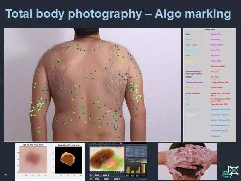 「DermaCompare 這款應用可以讓患者通過簡樸數字攝像頭拍攝的『全身攝影(TBP)』,進行自我皮膚檢查!筗ayne說道。用戶可以自行下載應用和解釋說明到任何帶有數字攝像頭的設備上。 Wayne 解釋說,一旦病人將他或她的「全身攝影」圖像上傳到他們在 DermaCompare 云服務器的私有文件,以便存儲和預覽,那么,DermaCompare 平臺就會(1)將圖像與病人文件中的任意歷史圖像進行比對,同時也和公司數據庫相關的圖像進行比對;(2)更新病人的文件,創建一個數據要點摘要,列出和病人皮膚圖像緊急相關的數據,以及任何可疑的圖像變化的預警信息;(3)通知相關醫生獲取、審視打印好的病人的數據圖表和全身攝影圖像。它會自動地匹配云服務器中五千萬種已知痣斑圖像以及病人的歷史圖像。這項技術極大地增強了醫生檢測玄色素瘤的精準度和速度。