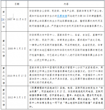 2月25日,國家體育總局發布《體育總局關于切實落實彩票資金專項審計意見加強體育彩票治理工作的通知》,受該通知的影響,部門省級彩票治理中央從2015年2月25日起暫停接受互聯網彩票銷售訂單,公司無紙化彩票代購業務從2015年2月25日開始暫時休止,詳細恢復時間待定。 2月25日,國家體育總局發布《體育總局關于切實落實彩票資金專項審計意見加強體育彩票治理工作的通知》,受該通知以及財政部、民政部和體育總局聯合下發的《關于開展擅自利用互聯網銷售彩票行為自查自糾工作有關題目的通知》的影響,部門省級彩票治理中央從2015年2月25日起暫停接受互聯網彩票銷售訂單,公司無紙化彩票代購業務從2015年2月25日開始暫時休止,詳細恢復時間待定。 對于涉及互聯網彩票業務的上市公司來說,受《通知》影響,我國唯逐一個在美國納斯達克上市的互聯網彩票銷售概念股“500彩票網”股價單日暴跌22.37%,盤中最低到達9.55美元,已不足歷史最高價的五分之一。繼500彩票網停售4種高頻彩后,阿里、騰訊、人民網旗下互聯網售彩平臺也接踵公布暫停全部或部門彩種的銷售。