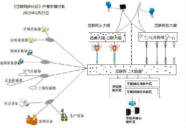 4.2014年繪制出“互聯網大腦的左右大腦結構圖”,提出以搜索引擎為出發點的百度大腦,谷歌大腦等互聯網人工智能系統將進化成為互聯網的左大腦,以Facebook,QQ,微信為代表的社交網絡正在形成互聯網的右大腦.“