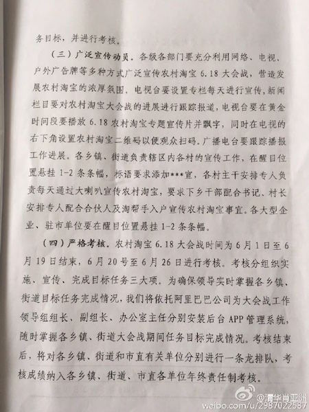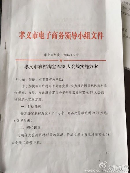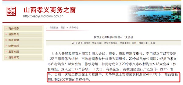 當前,競爭日趨慘烈的“6.18”大戰終于落下帷幕,各大電商平臺紛紛曬出自己的“成績單”。根據農村淘寶宣布的數據,家電類產品在今年618期間銷量最佳,農村淘寶好像已儼然成為家電數碼產品下鄉的主陣地。 然而,在阿里村淘看似繁榮的營銷數據背后,卻躲藏著行政干涉干與這只怪手。據傳,山西孝義市近期就發布了一份令人咋舌的文件,要求下級單位配合完成阿里村淘6.18交易額等指標。 一、為推進阿里村淘項目,孝義市強制向下攤派消費指標 日前,網絡上曝出一份山西省孝義市電子商務領導小組下發的紅頭文件,引來網友的廣泛關注和吐槽。文件內容顯示,該市要求下級單位完成農村淘寶在6.18期間的APP安裝量和交易額指標。 詳細來看,孝義市擬定在2016年6月1日至19日期間,完成“安裝綁定農村淘寶APP 7萬個,商品交易額達到2600萬元”的目標任務。為此,孝義市將指標細化后,對市委、宣傳部等機關及企事業單位下發了明確的任務指標,甚至轄下的各鄉鎮、礦區和學校都被分配了上百、上千的APPA綁定任務。 同時,孝義市要求各鄉鎮、街道和市直有關單位分別進行一條龍排隊,考核成績納入年終責任制考核?己艘劳邪⒗锇桶凸緸榇髸鸸ぷ黝I導組組長、副組長、辦公室主任分別安裝后臺APP治理系統,隨時把握各單位任務目標完成情況。