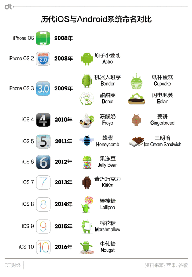好吧,別告訴我你當真讀完了。 DT君給不喜歡句讀的你來翻譯一下:這不是iOS所以我并不關心安卓取什么名字,以及我不分單詞有關系嗎…… 好的,DT君不是故意要用iOS擁躉來黑安卓黨的,咳咳。因此下面這些信息,足以撫慰安卓黨們受傷的心靈。 移動系統命名PK:安卓呆萌小甜心,蘋果板著臉數數 DT君臆測,泛博蘋果用戶和使用著“改良”過的安卓系統的中國用戶,對安卓原生系統的命名方法并不認識。 實在從2009年5月開始,安卓系統就開始使用甜點來作為版本代號,這些版本按照大寫字母的順序來進行命名,目前最新版本輪到了N。在此之前,谷歌曾經用過原子小金剛(Astro)和機器人班亭(Bender)這種不明覺厲的名字,之后就越來越接地氣——不包括最新的牛軋糖的話,從C開始安卓已經使用了11個甜品進行命名。 谷歌為這些版本都制作了雕塑。但是DT君覺得,看著身穿谷歌T恤的程序員,爭先恐后和甜甜圈、三明治們合影,畫面卻有些詭異。 至于為什么選了這么個方法進行命名,谷歌發言人沒有給出任何清晰的理由:“這就似乎某種內部團隊的事情,我們想做的有點——怎么說——有點神秘。” 這樣的命名風格就和這個安卓機器人一樣,顯得活潑但又有點“脆弱”,與蘋果對其移動系統IOS的命名比擬,風格迥異。下面這張圖,足以說明題目: