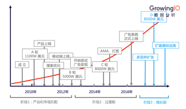 Sean Ellis,在2010年最早提出Growth Hacker的概念,他先后效勞于多家硅谷創業公司并協助 Dropbox 完結了年500%的添加。Sean Ellis 以為一家成功的創業公司必定先后閱歷三個期間:Product / Market Fit(商品和商場匹配期)、Transition to Growth(過渡期)、Growth(添加期)。 SocialCam 失利的地方就在于前期商品還沒有和商場匹配就開端大規模擴大之路,就像房子地基沒做好就開端蓋樓,失利是必定的。 回到咱們今天的主角 Quora ,它前期的添加速度遠遠沒有 SocialCam 那么冷艷,可是一向穩定添加。那么八年來,Quora 是如何一步一步走過來的呢? 二、Quora 的添加黑客之旅 正如上面的創業金字塔模型,Quora 的添加進程能夠分為明顯的三個期間。 (一)商品和商場匹配期Quora 在融資方面的表現十分奇特,商品上線前 3個月就取得了 1100 萬美元的 A 輪融資,估值 8600萬美元。這不只得益于創始人自身的明星效應(他是 Facebook 的首任CTO),更是由于 Quora 對商場的定位十分精確,他們的中心價值點即是高質量的內容。