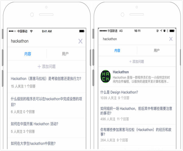 算法也做了優化,好比搜索 hackathon,以前匹配問答中含 hackathon 這個樞紐詞的題目,這些題目質量并不好,現在不僅給出高質量的相關題目,還顯示話題。