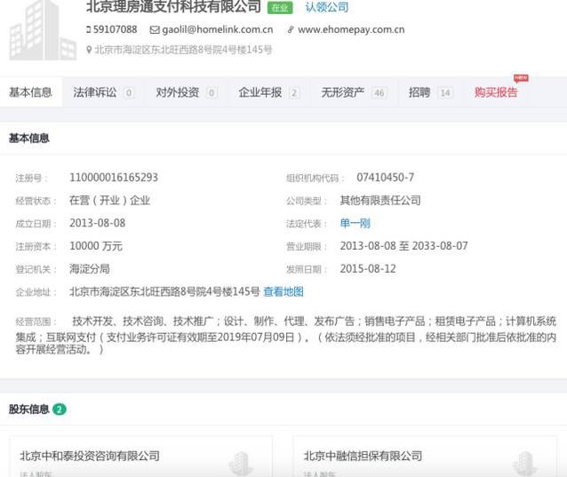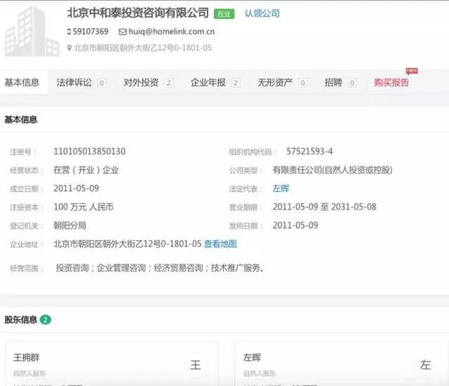 (相關工商資料信息來自企查查) 理房通注冊于2013年8月,法人為單一剛,身份是鏈家地產的執行董事。理房通的股東為中融信擔保和北京中和泰投資咨詢有限公司兩家,而北京中和泰投資咨詢有限公司的股東除鏈家地產董事長左暉外,還有鏈家地產副總裁王擁群。