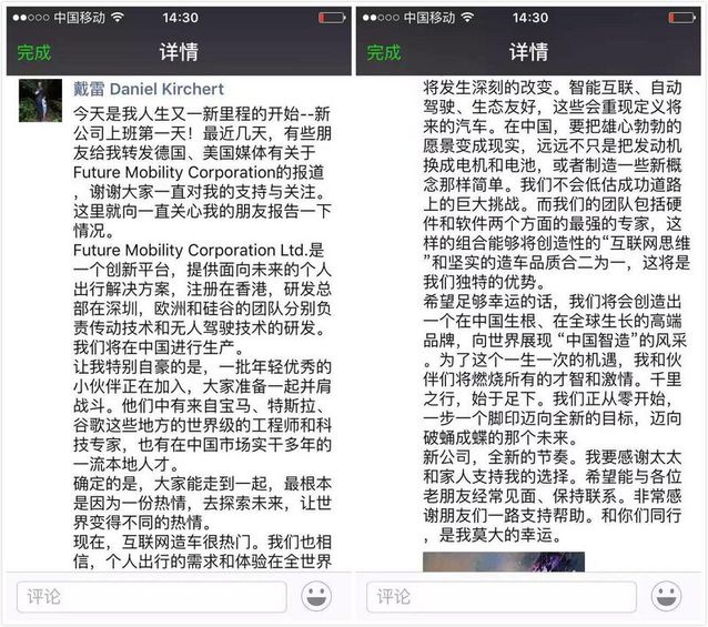 Future Mobility COO 戴雷的朋友圈 目標是打造一個高端電動車品牌的 Future Mobility 注冊在香港,研發總部位于深圳,傳動技術和無人駕駛技術的研發分別放在歐洲和硅谷,將在中國進行整車出產。 和諧富騰旗下電動車項目經濟+高真個產品組合,很輕易讓人聯想起車和家、蔚來汽車這兩家電動車創業公司,他們的車型也分別定位于經濟和高端。 從產品角度來看,未來很有可能泛起愛車 vs. 車和家、Future Mobility vs. 蔚來汽車捉對廝殺的競爭局面。