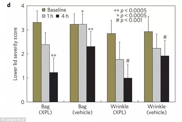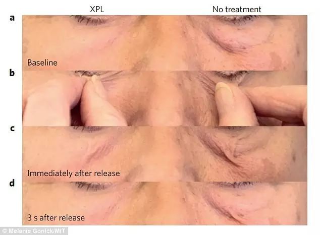 (圖8、還防水喲) 據研究職員表示,薄膜能在皮膚上施展很好的保護作用,減少水分流失,有望用于治療濕疹等皮膚! 假如加入防曬霜成分,這種薄膜還可能起到防曬作用! 對了,由于聚硅氧烷對可見光沒有顯著的吸收,厚度僅40至70微米,所以…… 它不但看起來基本和正常皮膚沒太大差別,而且還能消除眼袋和皺紋! 下面是科學家做的一組對比實驗數據,戴上它1小時和4小時后,眼袋和皺紋都有顯著的減少。!