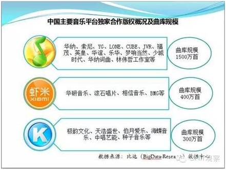 事實上,一張數字專輯的銷量可以反映出一家音樂平臺的多個方面。好比,首先可以反映出的是一家音樂平臺的人氣和用戶規模。從上述對比不丟臉出,QQ音樂顯然比酷狗擁有更為旺盛的人氣和更大的用戶規模。其次,也反映出一家音樂平臺的營銷力,銷售數字單曲與網友自行收聽免費單曲是完全不同的用戶行為,從上述對比來看,QQ用戶的活躍度和消費能力更高,而酷狗區區不足5萬的銷量則反映出了酷狗這家音樂平臺用戶活躍度和消費能力的不足。 實際上,之所以有這樣的懸殊,主要還在于一家音樂平臺是否能獲得大牌本身的認可和資源整合能力。以張杰為例,與老東家天娛解約后,張杰的新專輯與福茂唱片展開戰略合作,開啟個人“我想”音樂計劃。而作為福茂唱片的獨家版權合作伙伴,張杰入駐福茂后也獨家牽手QQ音樂,成為平臺上又一閃亮的巨星,騰訊公司副總裁彭迦信先生曾在發布會現場宣布了張杰首張數字單曲的預售成績,最新單曲《我想》僅預售48小時就達50萬白金銷量,創造未正式上線就破白金銷量的新紀錄,白金唱片認證也成為QQ音樂送給張杰全新啟航最好的見面禮,而正式上線僅兩天總銷量突破70萬,音樂價值得到充分彰顯。 數據顯示,作為中國數字專輯發行序幕的開啟者,從2014年底周杰倫的《哎呦,不錯哦》開始到2015年,QQ音樂平臺共計為近20位歌手發行共近30張數字專輯,從首創巨星周杰倫到新偶像鹿晗,再到韓國天團BIGBANG、歐美天后Rihanna,僅一年時間數字專輯總銷量突破1000萬張,鹿晗和BIGBANG、Rihanna等銷量屢破百萬張銷量紀錄,QQ音樂此舉也被以為,標志著中國數字音樂時代的正式來臨。 而反觀酷狗,在數字專輯和數字單曲的發行力和營銷力上仍是力不從心的。 版權危機 版權是一家音樂平臺的立命之本,用無版權不音樂來形容亦不為過。目前主要平臺音樂版權及曲庫貯備情況可以從下圖中一探畢竟: