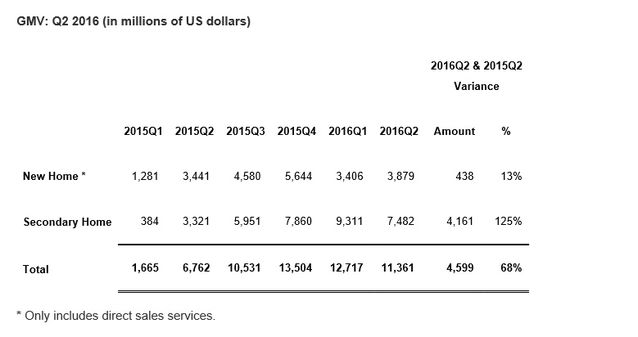 ![]() 2016年8月25日,在美國紐約上市的搜房(房天下 SFUN)宣布了本年度第二季度的業績。 2016年第二季度的總收入為2.87億美元,收入同比增長率為34.2%;其中互聯網服務e-commerce service 收入為1.895億美元,同比增長率高達77.4%。 2016年第二季度EPS 是-0.09,虧損金額遠低于華爾街分析師預計EPS 均勻值的-0.12。 此外,本季度公司的GMV 增長勢頭不錯,同比金額增長68%,這個指標是搜房轉型的重要經營業績指標之一。以下為公司所宣布的各季度GMV 增長情況: