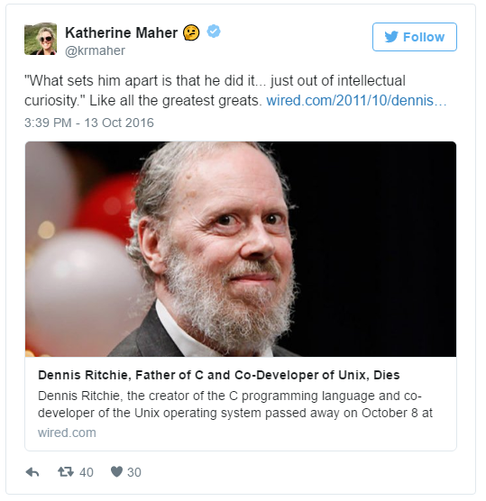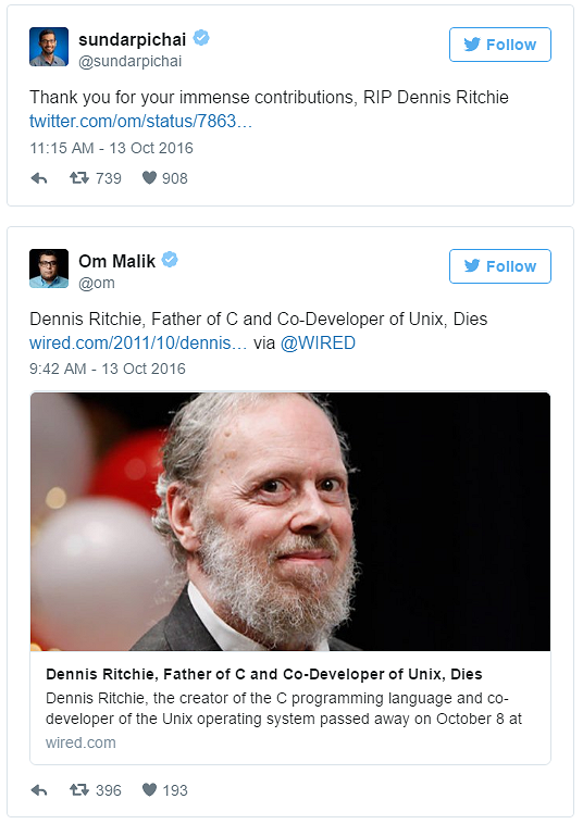 Dennis Ritchie 對于現代軟件技術的貢獻是毋庸置疑的,身為 C 語言同時也是 UNIX 之父,對于現代軟件以及系統的影響當然非常大。他在 2011 年 10 月 13 日于紐澤西過世,當時引起很多科技業重量級人物的哀悼。不外,基于某些錯誤,他近日在 Twitter 上“再度”過世了一次。 在社交網站上都有一些演算法的機制,會回顧過去幾年這一天所發生的信息。有的時候我們一不小心沒有留意日期,就會誤認為是當天所發生的事情。而這個在美國科技圈發生的烏龍事件,不清晰是不是也是由于這個演算法所引起的。 事情到底是誰開始?不外根據 fossbytes的考證,溯源追蹤到 CNET 的科技界著名記者 Om Malik,他在 Twitter 發了一篇引述 Wired 報導、哀悼 Dennis Ritchie 的推文。而 Google 的 CEO Sundar Pichai 也推了這篇文章。 因為 Om Malik 的影響力,接下來又引出了兩位科技界的大咖的轉推。像是 Craig Newmark,Craigslist 的創辦人。 Katherine Maher 目前負責主管 Wikimedia 基金會。 因為這些科技大咖的影響力,當然這個“謠言”就開始在科技圈傳開了,一大堆人開始在 Twitter 上對 Dennis Ritchie 進行哀悼。 事情一直到 Om Malik 自己發現了錯誤,他連忙在自己的博客上發布了一篇報歉文,表示自己分享了一篇 Wired 的報導,卻沒有留意到報導的日期,沒有發現 Dennis Ritchie 早在與喬布斯過世的統一年就“已經”過世了。 不外,往好處想也由于這個原因,讓 Dennis Ritchie 他對于眾人的貢獻再度被喚醒。 |