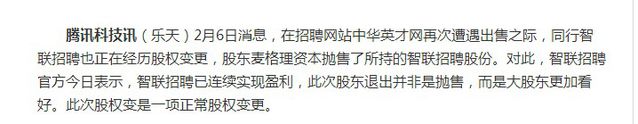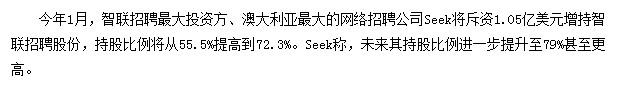 圖2:在窩窩團招股書Preferred Shares一欄中寫到,窩窩團在2011年4月的A-1輪融資中獲得了清科資本的500萬美元融資;5月和6月,鼎暉、清科分別跟投了3000萬、200萬美元;7月,Besto Holdings、天助等機構共計注資1800萬美元。2012年2月B輪融資中再獲得1250萬美元的融資。 窩窩團虛報融資是一個最具代表性的案例。窩窩團最開始向外公布上述融資動靜時,聲稱融資將來自高盛。而媒體就此事采訪高盛時,其相關負責人表示,對此事不作評論,但又建議記者,應當繼承關注這條動靜,真相會得到澄清。 高盛謹嚴克制的暗示背后,代表了窩窩團在資本市場上的潛伏危機。虛報融資這一行為,很可能導致外界在觀感上把VC/PE當成同謀,危及投資機構的信譽、職業道德。而如斯開罪資本世界中的聞名機構,其實“勇敢”。 第二名、 智聯招聘651萬美元變1億美元報道融資額:1.05億美元 真實融資額:651萬美元 2013年1月,智聯招聘二股東麥格理拋售了手中全部股份,總價約近億美元。隨后有動靜稱Seek斥資1.05億美元接手麥格理拋售的股份,同時智聯招聘官方也公然回應,稱二股東麥格理退出并非是拋售,而是大股東Seek更加看好。 在這起交易后,智聯招聘估值達到了5.58億美元。 以下為媒體報道截圖:
