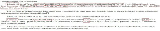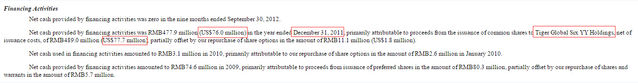 圖4:2011年8月,YY曾三次向老虎基金發售普通股共計7500萬美元。