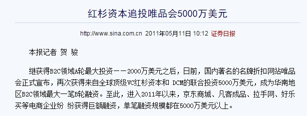 圖7:2007年7月26日,B輪融資,向IDG增發B輪優先股5,643,990股,每股0.8859美元,對價為500萬美元。 第五名、 唯品會灌水近900萬報道融資額:5000萬美元 真實融資額:4120萬美元 2011年5月,唯品會公布獲得紅杉資本和DCM的聯合風險投資5000萬美元。有趣的是,為了能給自身項目冠以“最大的”稱號,公關部分使用了“華南地區”這樣的定語。 以下為媒體報道截圖: