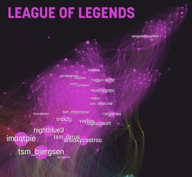 上圖是聞名游戲視頻網站Twitch釋出的游戲觀眾關系圖。圖中每一個圓點都代表一個實況臺,圓點的大小代表觀眾數多少,而點與點之間連線的疏密及是非代表這些實況臺之間共享觀眾的程度,因此可以從這些連線來觀察各類游戲觀眾的交集。我們可以顯然地看出兩個現象: 1.大多數游戲之間的觀眾共享程度很高,等于說良多游戲的觀眾是一會兒觀看這個游戲一會兒觀看那個游戲的,包括英雄同盟、爐石傳說、魔獸世界等聞名游戲皆在此列。 2.以DotA2和坦克世界為代表的觀眾群遺世而獨立,游戲擁有極強的獨有性。 我們再來看兩張更具體的對比: