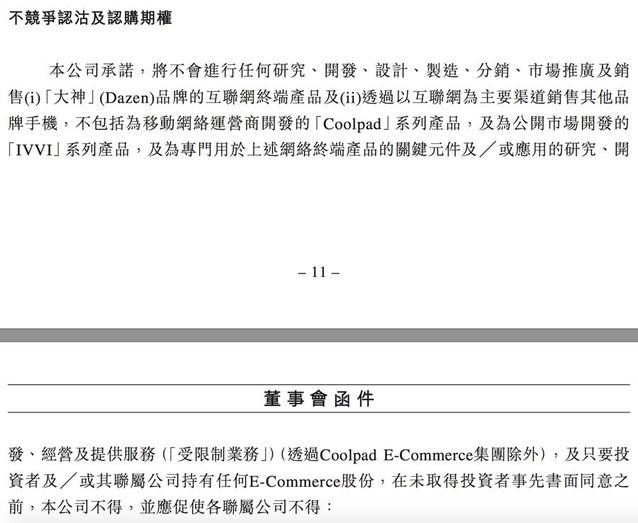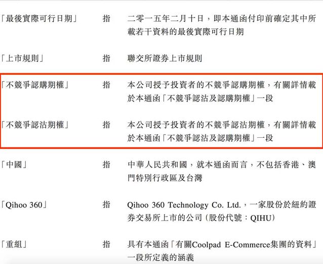 圖4 那么360和酷派的“認沽權”是怎么劃定的呢?可以看出,假如雙方劃定了兩種方式“不競爭認購期權”和“不競爭認沽期權”(圖5),并且分別劃定了相應的權利和義務(圖6-圖8),尤其是圖7,非常具體的劃定了假如違背“不競爭認沽期權”的內容,即酷派不得直接或間接于中國或美國“在與受限制業務相同或相似或與之競爭的任何業務中擁有任何權益、治理、控制、介入、咨詢、提供服務或以其他方式從事,或從事協助”,而眾所周知的是,2015年6月28日,酷派發布的《控股股東出售股份公告》顯示,郭德英家族通過信托計劃持股的Data Dreamland以3.508港元每股的對價向樂視聯系關系公司出售7.8038億股,占已發行總股本的18%,后者曾經推出了多款手機產品,與360、酷派合資的奇酷科技的業務線重疊嚴峻,顯然,酷派這是演了一出“一女嫁二夫”的小算盤,但是卻健忘了當初與360簽署的協議,以及必需履行的義務。