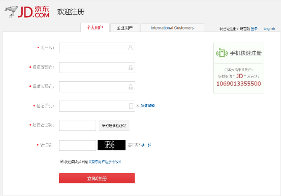 京東分為個人、企業、國際三類用戶,用戶注冊需要填寫的選項良多,較為繁瑣。