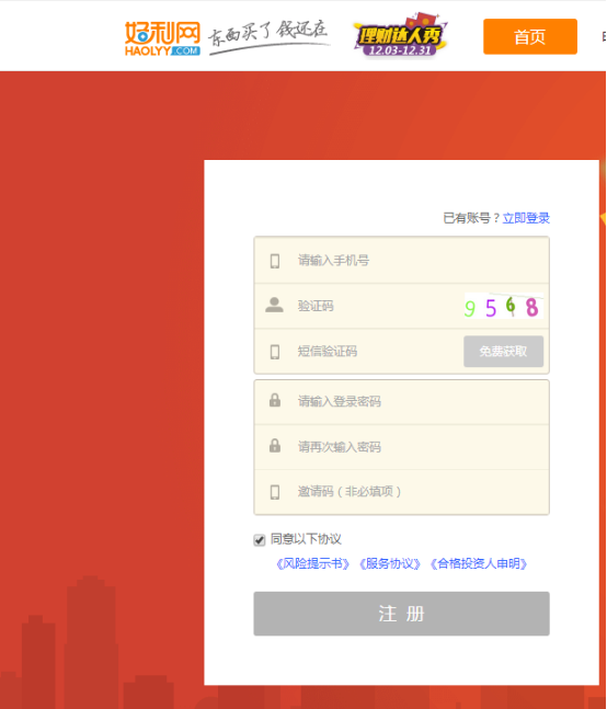 如下圖好利網注冊頁面,需要用戶輸入兩遍密碼,以及邀請碼,邀請碼對于邀請人來說有一定的優惠補償(類似于推廣獎勵),所以將其作為選填放在注冊頁面。