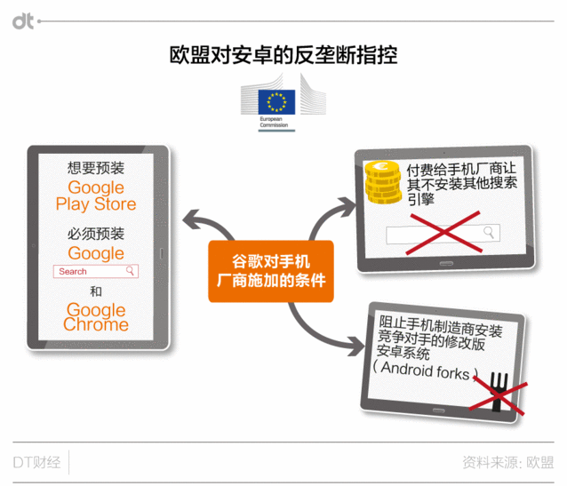 實在,一開始歐盟成立調查組,就是為了避免案件像此前的微軟反壟斷案一樣,一拖就是十多年。歐盟起初但愿可以快速找到證據,對谷歌進行懲罰。但事到如今回頭看,歐盟顯然沒能實現愿望,如今案件也拖了近六年,而且終極仍是要靠正式訴訟來終結糾紛。 《逐日電訊報》的報道中,也引述分析人士稱,在多年的糾纏之后,谷歌已經不想再繼承耗費精力財力,也打算接受罰款終止案件。 歐盟放大招,歷數谷歌安卓系統的三大罪狀 那么歐盟這30億的罰款,畢竟是因為谷歌的什么罪狀呢? 上月底,歐盟發布的最新聲明,將戰線擴展到了谷歌移動市場的核心業務——安卓系統。在歐盟的官方聲明中,歐盟指出了谷歌的三大罪狀: