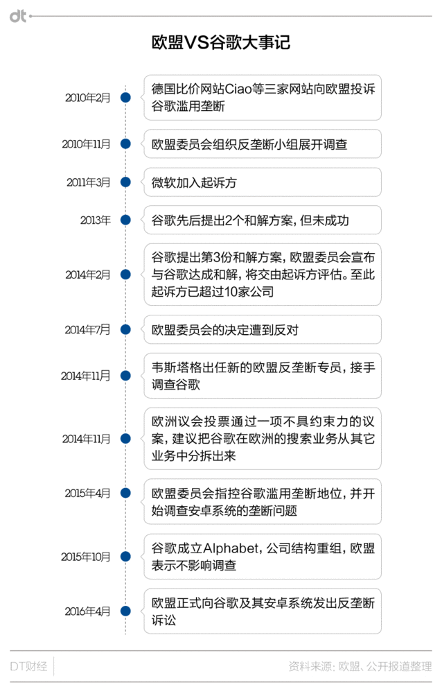 谷歌的反壟斷案,可能即將以30億罰款來終結 據英國《逐日電訊報》報道,歐盟委員會近期將公布對谷歌涉嫌壟斷的罰款數額,而這一數字可能高達破紀錄的30億歐元。而到目前為止已有的最高反壟斷罰單,是2009年對芯片制造商英特爾公司11億歐元罰款。 讓谷歌雪上加霜的是,這30億歐元恐怕還不是上限,根據相關法律,歐盟委員會最高可以對公司處以其年營業額10%的罰款。也就是說,谷歌公司面對的罰款上限將達60億歐元。 事情大概是這樣的:2010年下半年,幾家搜索及比價網站指控谷歌利用其搜索上風推廣自家服務,損害競爭對手利益。之后歐盟對谷歌的反壟斷調查開始,這一被形容為“史詩級”的訴訟正式拉開序幕。在之后的近6年的調查中,谷歌曾先后三次提出和解方案,但終極都被拒絕。 DT君為大家總結了這場訴訟的歷史: