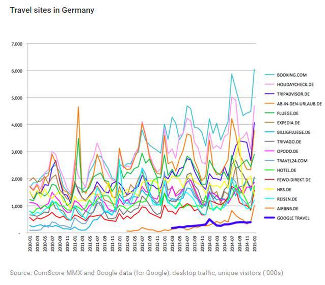 歐盟指責谷歌人工干涉干與了搜索結果,不外這里要提醒大家的是,DT君經由調查發現,谷歌受到的指控并不是類似百度這樣的販賣廣告位等,而是將自己的一些產品排在了更優先的位置。這些被指控的產品,也都不是最核心的產品,好比Google Travel、Google Shopping等。 谷歌在遭到指控后作出回應,不無委屈地曬出這些產品在一些歐盟國家可憐的市場份額。谷歌表示,旅行搜索是一個競爭激烈的垂直市場,而自己的據有率實在少得可憐。