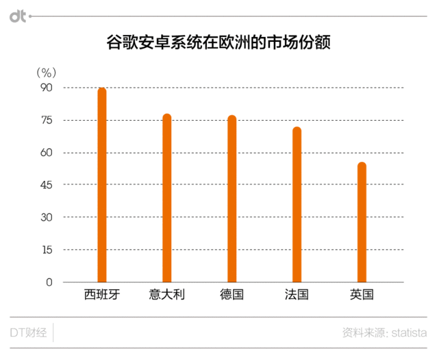 可以看出,歐盟主要針對的是谷歌預裝安卓及自己軟件的行為。歐盟以為,谷歌這樣做是在抹殺規模較小的立異型應用制造商和服務供給商。 實在,對于預裝行為的懲罰,歐盟此前也干過。2007年了解的微軟壟斷案中,歐盟就是認定微軟濫用了其在個人電腦(PC)操縱系統領域的主導地位,向消費者強行推廣其媒體播放器,案件的總罰款超過20億歐元。 但此次案件與之不同的是,微軟的預裝可以直接帶來銷售利潤。而安卓則是免費的。那歐盟為何還這么擔心呢?恐怕是由于谷歌安卓在歐洲的“勢力”其實太大。 根據statista的統計,安卓在歐洲各國的市場份額很高,在西班牙甚至達到了九成。