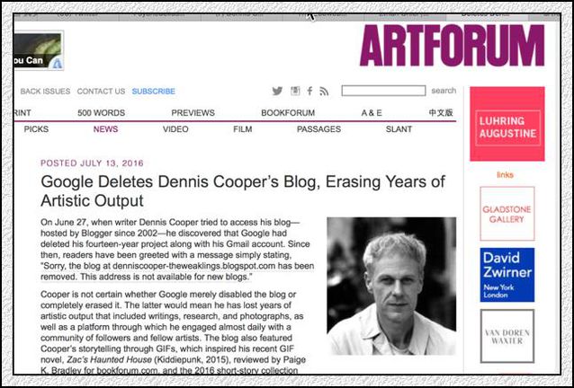 棲身在法國的美國藝術家丹尼斯·庫柏(Dennis Cooper)14年來發布在全球最大的互聯網平臺上的作品溘然消失了,他的谷歌博客、谷歌郵箱同時被刪除。 丹尼斯·庫柏從2002年起開始使用埃文·威廉姆斯創辦的博客平臺Blogger,2003年,谷歌收購了Blogger。今年6月底,庫柏發現他的博客被下線了。同時,他發現自己的谷歌郵箱也被禁用了。 庫柏告訴聞名新聞網站 Fusion 記者伊森·切爾(Ethan Chiel),谷歌沒有給出任何刪除其博客與郵箱的理由。