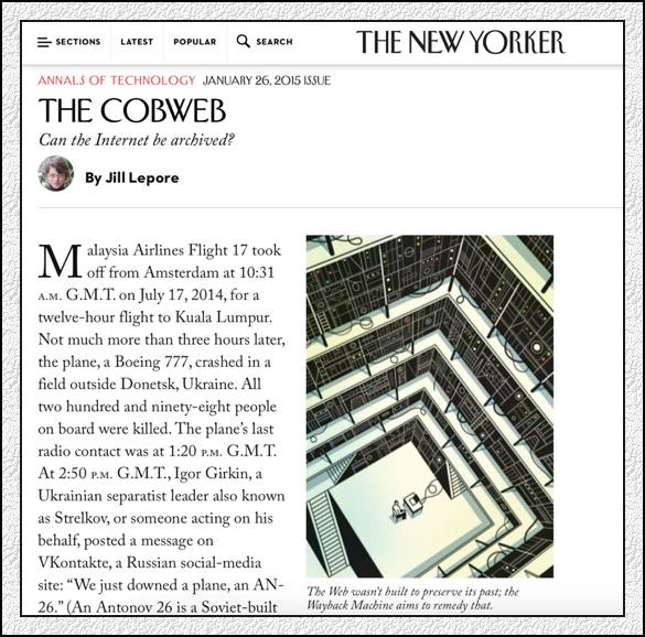而互聯網檔案通常不僅僅是你我的,互聯網是人類的集體記憶,他們不應該被遺忘。 一位棲身在法國的美國先鋒藝術家的色情作品是不是被消失,坦率地說,根本不必大驚小怪;在《花花公子》雜志自覺自愿地讓其封面少女穿上衣服而不是脫光衣服以吸引讀者的時代,拿風化說事太無聊了。杰羅姆放不下這個話題,一定要說上幾句的原因是,這位藝術家面臨的題目,既不是版權,也不是風化,而是一個人的故事與這個故事存在的權力。每一個人的故事與作品,構成了這個世界與這個時代,只有通過記憶每一個人的故事與每一個人的作品,歷史才有可能呈現自己完整的結構與色彩。谷歌或者其他隨便任何人,在沒有拿得出手的理由的情況下,怎么可以抹去這個人以及他的故事? 當然,這樣戲劇性的情節,仍舊不是題目的樞紐。更讓人驚奇的是,關于互聯網的集體記憶,也在淡出,谷歌在有意無意地拋卻“記憶”,記憶是有本錢的,那些并不能產出利潤的過去,值得以贏利為目的的企業去動用龐大的資源,存檔嗎? 當然,網絡記憶不是谷歌的題目,這是網絡時代的題目!都~約客》雜志去年有一篇十分出色的文章《蛛網:互聯網可以被存檔嗎?》