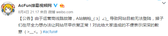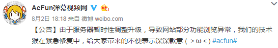 A站2016年8月2日就在官方微博上表示,因為A站服務器暫時性調整進級,導致網站部門功能瀏覽異常,A站的技術職員在緊急修復中,給大家帶來的不便表示深深歉意。