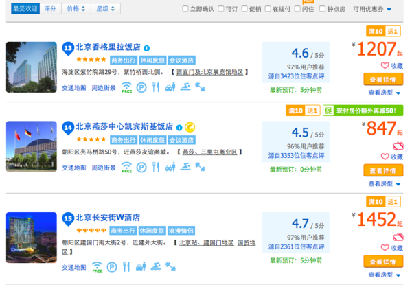 同樣以北京地區為例,在攜程的酒店頁面勾選“五星級/豪華”后,泛起的酒店以香格里拉、凱賓斯基、威斯汀、喜來登等高端連鎖酒店、以及國際飯店等單體高端酒店為主?蛦蝺r普遍在800-1500左右。