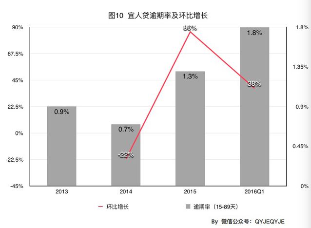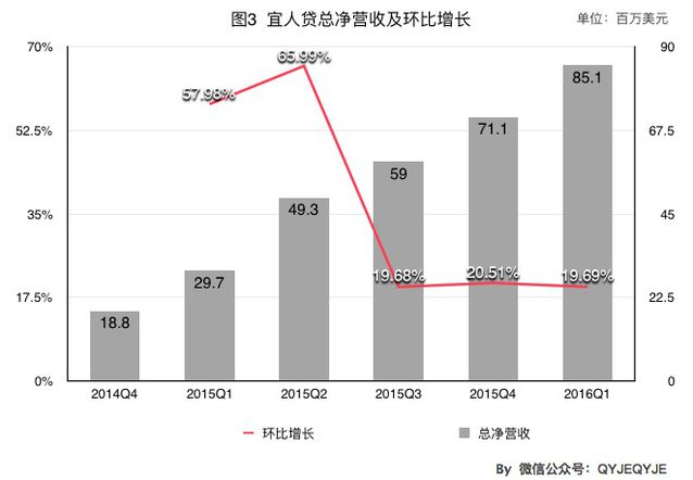 圖中紅框部門顯示,在Q2季度,Deferred revenue(遞延收入)和Cash revenue泛起失常,不遵循相關會計配比原則。 而風險預備金項,基本維持在總收費額的30%左右,符合配比原則。 (遞延收入,是暫時未確認的收益意思,由權責發生制和收付實現制的暫時性差異產生)。 因此,我們發現了秘密所在:宜人貸通過調整遞延收入確認時間以及人為控制的現金激勵,調整了會計利潤,以符合相關上市要求。 這也解釋了,為什么凈利潤和總凈營收,會在Q2季度泛起意外不符合相關會計規律的現象。 在以后解讀宜人貸財報,這兩個數據,將是考驗利潤“含金量”相對有效的地方。 在2016Q1季度,同比增速情況如下: