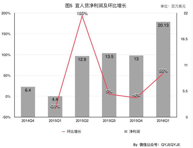 (注:總收費額,意思毛收入總額,有兩個來源部門,一是來自借錢的人,另一部門來自投資的人,其中借錢的人,占大頭。也即從事中介借貸服務,兩端收取的手續費,為其所有收入) 然而這樣一種變化趨勢,無疑是難以讓資本市場滿足的。 對于各家P2P平臺而言,平臺的借款總額,就猶如電商行業的GMV,體量和增速對公司在資本市場估值尤為致命。 作為一家奔跑著的創業公司,它的環比增長速度,卻泛起大幅度下滑。這是一個非常致命的信號。 假如后期發展增速繼承疲軟,那么華爾街將改變對其估值模型:由高速成長模型轉變為成熟緩慢發展模型。 公司發展速度,回到社會資本均勻增長水準;股價也回調至緩慢上漲。 當然,下一階段考慮到沒有了春節這個季節因素影響,個人以為存在一定的止跌可能; 然而,對于最近這段時間美國嚴肅的監管立場,LC丑聞、海內糟糕的投資環境,2016Q2季度的表現,應該不會比Q1季度好到哪里去。 對于資本市場而言,宜人貸發展遠景、想象力確實十分有限,股價不會泛起大幅上揚。 看點二:凈利潤表現搶眼,原來是存在很顯著的“操作利潤”情況