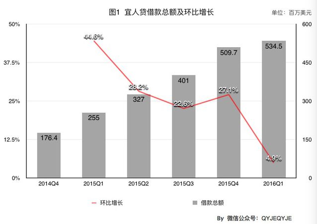 近期,跟著P2P標桿Lending Club的隕落,股價斷崖式暴跌,9年的co-founder and CEO被逐出公司,fintech概念從神壇走下; 美國財政部隨后于5月10日發布網貸白皮書,題為“網絡市場化信貸的機遇與挑戰”(Opportunities and Challenges in Online Marketplace Lending),闡述對行業擔憂,政策風口一再走緊; 雪上加霜的是,Google也于昨天晚間公布“下架小貸廣告”,成為壓垮美帝網貸的最后一根稻草,行業遠景堪憂。 而與此同時,大西洋彼岸擁有中國特色的P2P公司——宜人貸,高調發布了自己2016年Q1季度財報,華麗的數字,使得股價也應聲上漲5.83%。 本文將圍繞這一季財報,展開分析,探討財報數字背后,這家P2P公司詳細的發展情況。 財務業績分析 看點一:借款總額、總收費額,持續增長;環比增長,駛入慢車道 先來看每季度借款總額變化情況,如下圖1