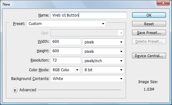 第1步:創立Photoshop文檔 該按鈕大。▽抶長)170像素x50像素。我們的畫布大一點,比如設為600像素x600像素