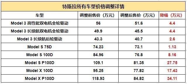 特斯拉全系車型再次呈現大幅調價,其最高降幅車型為Model X P100D車型,降幅達到了34.11萬。其中Model 3降價區間為2.6-4.4萬、Model S降價為1.13-27.75萬、Model X降價區間為17.45-34.11萬。