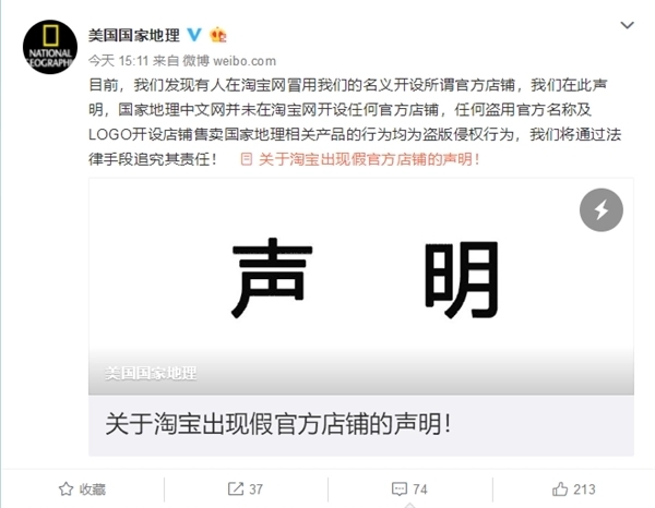 12月6日,美國國家地理官方微博發布聲明稱,淘寶有店肆盜用自己的Logo,出售盜版日歷,將會通過法律手段保護公司的權益和利益。