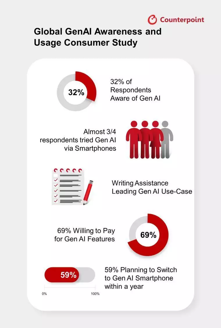根據 Counterpoint Research 的報告,生成式 AI 手機普及浪潮將至,以下是具體介紹: 消費者認知與意愿