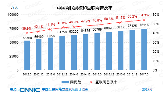 7 51億網民!到 2017年6月,我國互聯網普及率現已到達54 3%,非網民還有6 32億。昨天下午,我國互聯網絡信息中心(CNNIC)發布第40次
