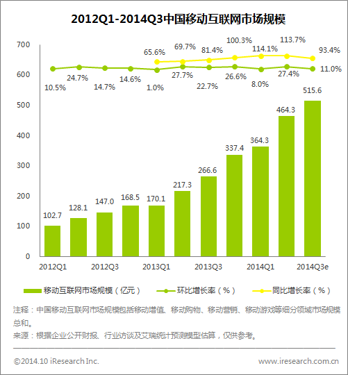 艾瑞咨詢數據顯示,2014年第三季度中國移動互聯網市場規模達到515 6億元,環比增長11 0%,同比增長93 4%。移動互聯網市場經由近幾年的快速