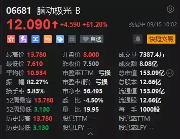 港股腦動極光-B在2025年9月15日的交易中表現非常驚人,一度拉升大漲超80%,報13.78港元,為接連第三日上漲,股價創上市新高,