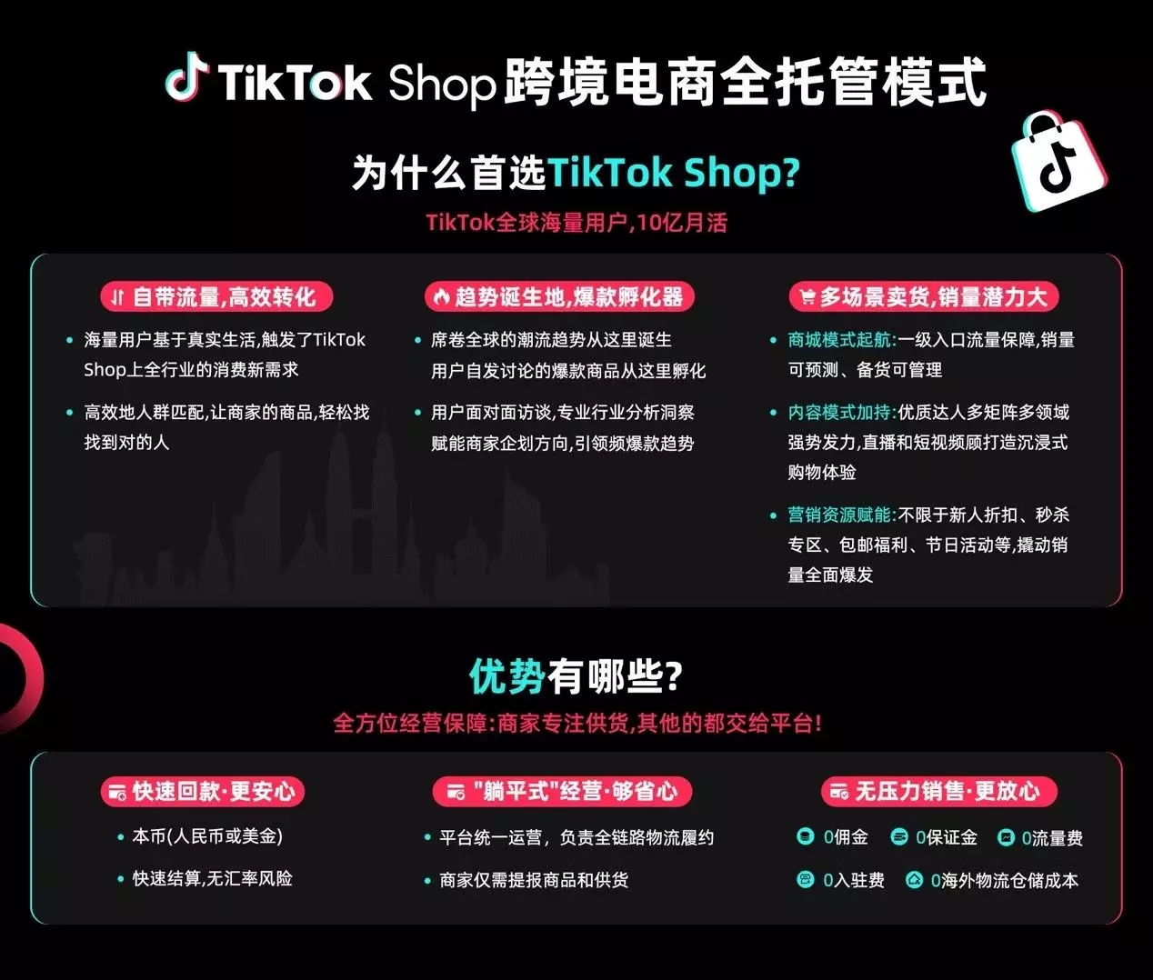TikTok Shop跨境電商5月16日宣告推出“全保管”運營形式,為商家供給更為快捷、高效的銷售渠道。商家只需供給產品供貨,減輕了運營本錢和危險,