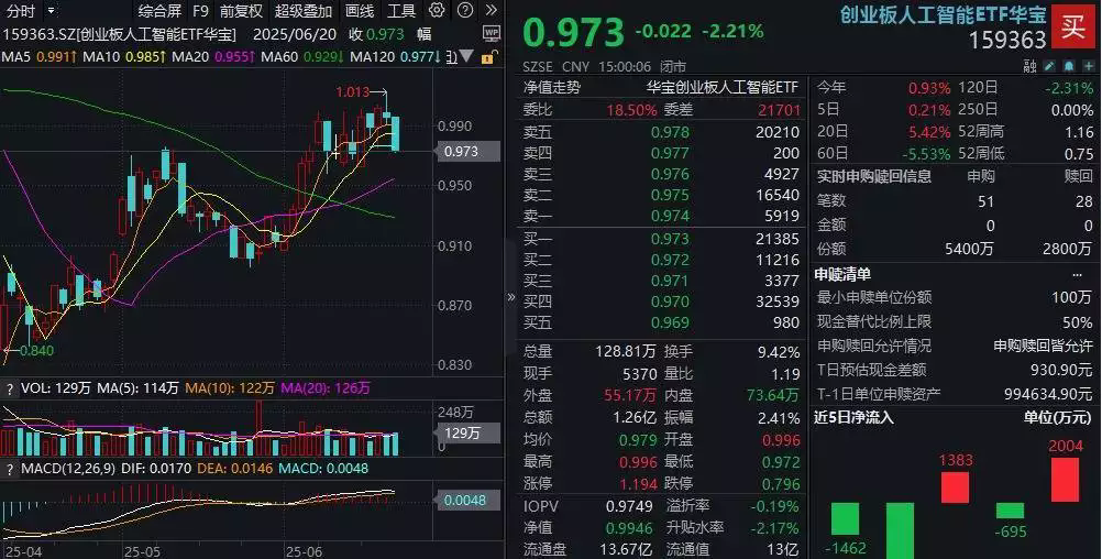 一、周五(6月20日),A股縮量震蕩,科技股全線走低。AI應用領跌原因:短期遇冷與結構性挑戰 市場表現 創業板人工智能ETF(159363):
