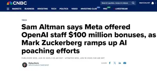 6 月 21 日消息,OpenAI 首席執行官薩姆・奧爾特曼(Sam Altman)周三表示,Meta 曾向某 OpenAI 員工開出 1 億美元(現匯率約合 7.18 億元人民幣)獎金來挖人,但未能成功。事件核心解讀