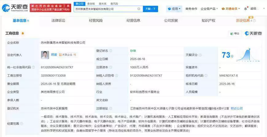 近日,蘇州新集思未來智能科技有限公司成立,法定代表人為顏盛,注冊資本1000萬人民幣,經營范圍包括計算機系統服務、人工智能應用軟件開發、