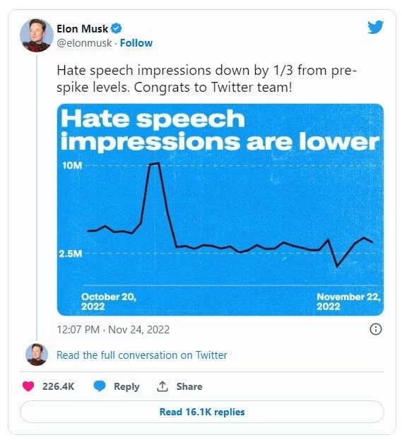 11 月 25 日消息,埃隆・馬斯克(Elon Musk)今日發布推文表明,自接手 Twitter 以來,用戶對該社交渠道的仇視言觀感有所改善。馬斯克稱,