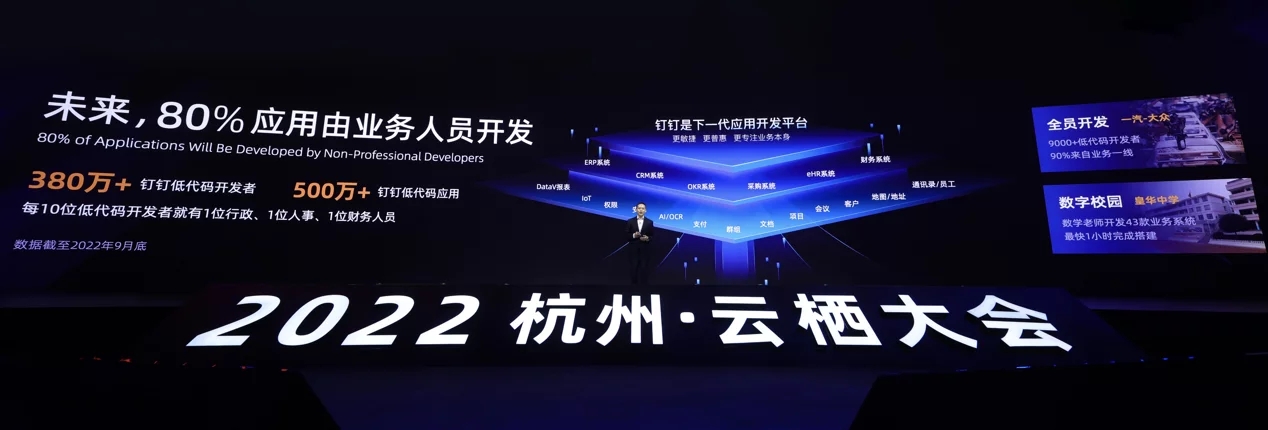 11月3日,阿里云智能總裁張建鋒在2022云棲大會發布,釘釘上的低代碼使用數打破500萬,低代碼開發者超過380萬。張建鋒表示,未來80%的使用會由事務人員通過低代碼開發。