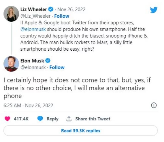 近來,視頻播客節目Liz Wheeler Show的主持人利茲·惠勒發推文表明,“假如蘋果和谷歌從它們的使用商鋪移除推特,馬斯克應該生產自己的智能手機。