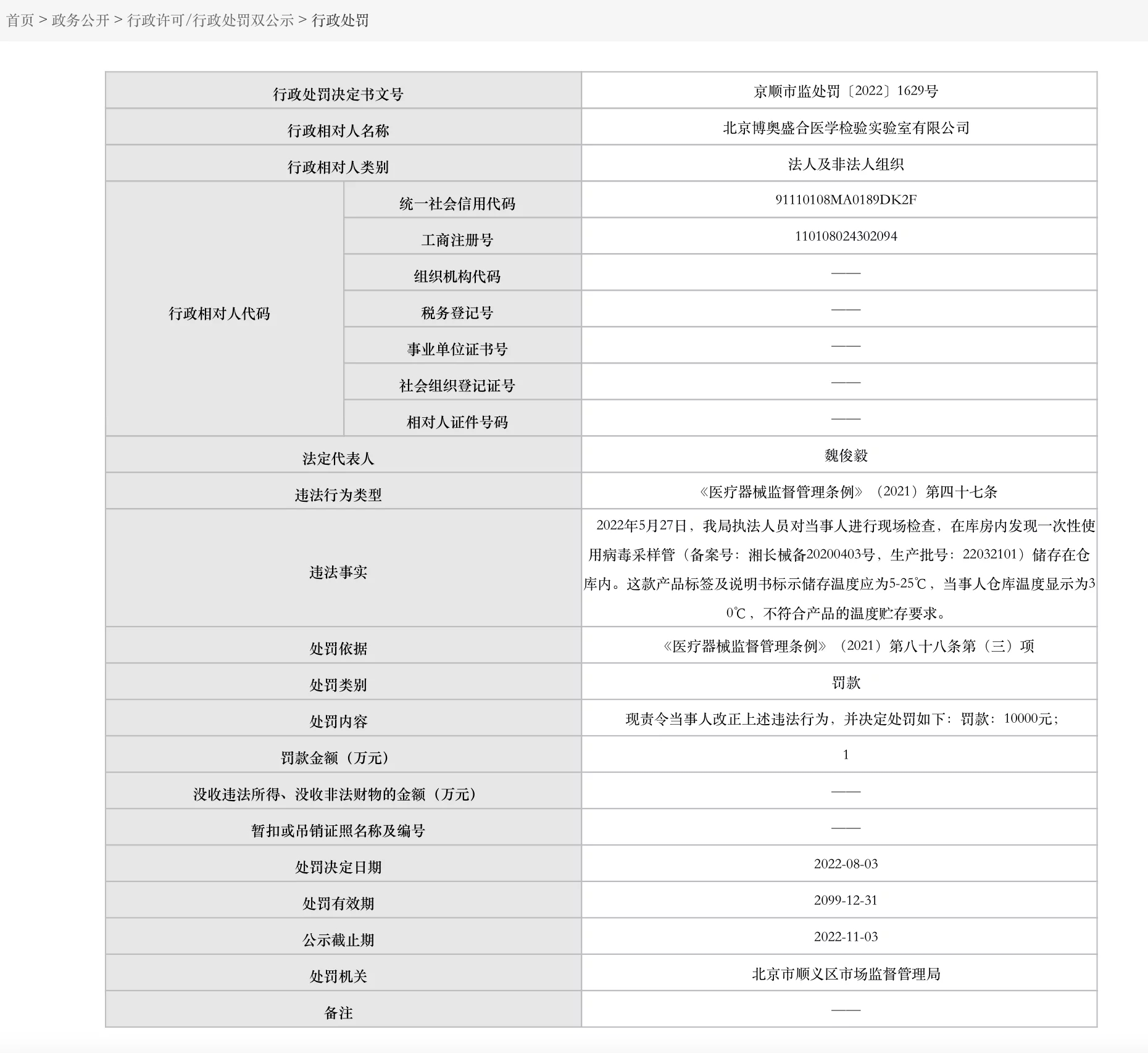 據北京市監局網站音訊,2022年5月27日,北京市順義區商場監督管理局執法人員對北京博奧盛合醫學查驗實驗室有限公司進行現場查看,